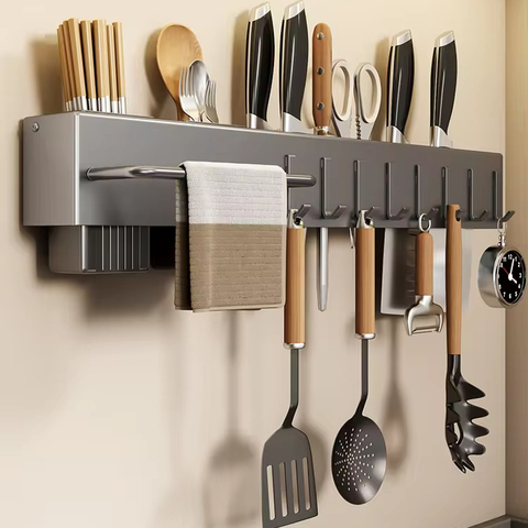 High Quality Metal Wall Mounted Organizer Carbon Steel Adhesive Kitchen Knife Spoon Holder Rack With Storage Towel Bar